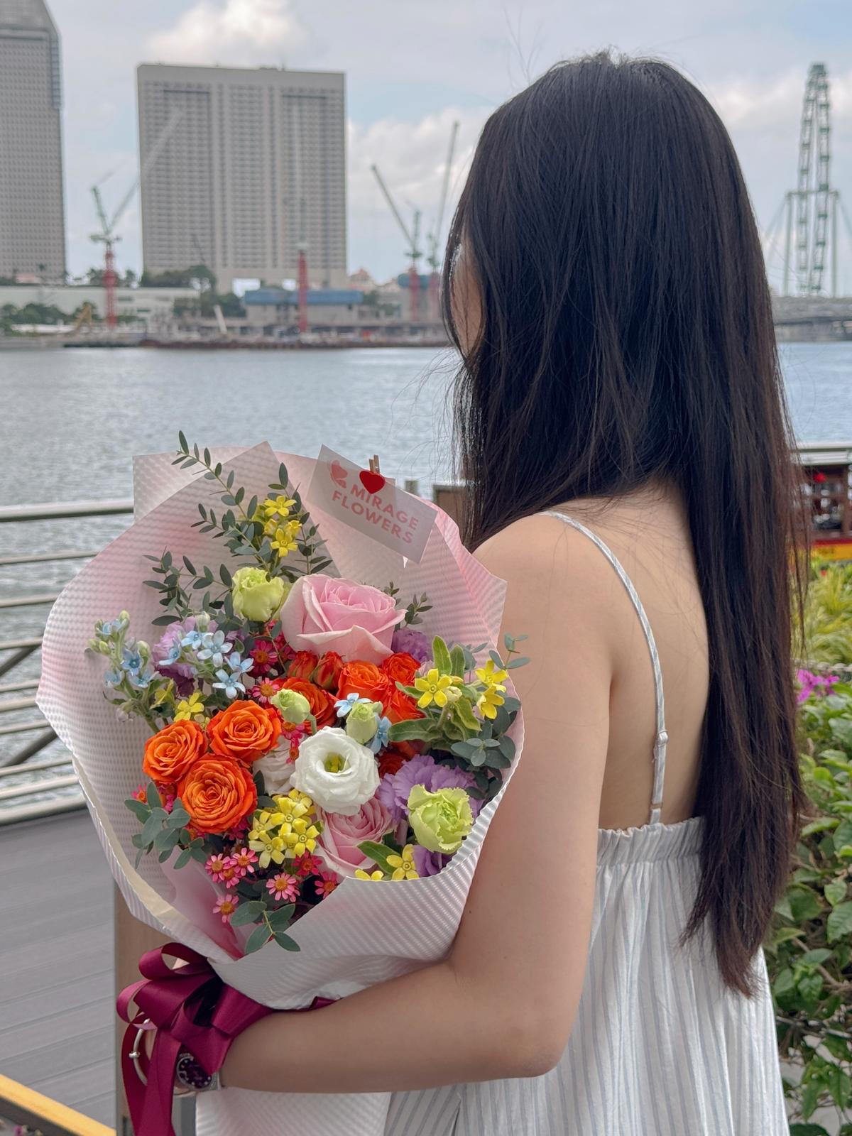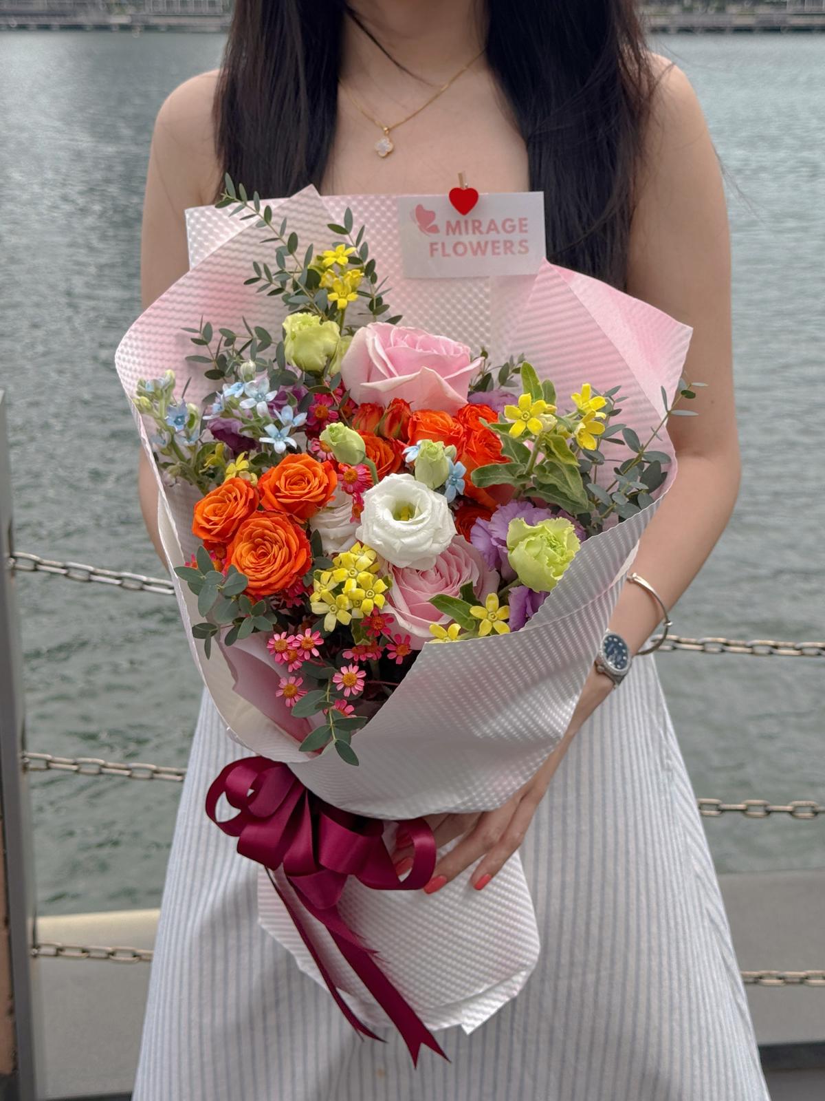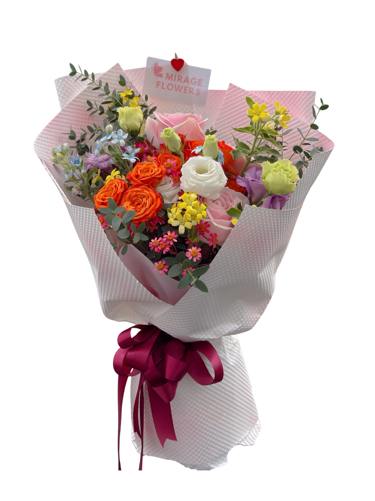 A vibrant Valentine’s bouquet featuring cheerful orange, pink, yellow, lilac, and blue blooms, accented with fresh green foliage for a bright, modern expression of love.